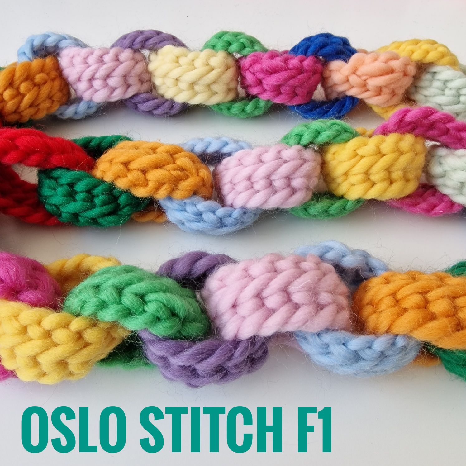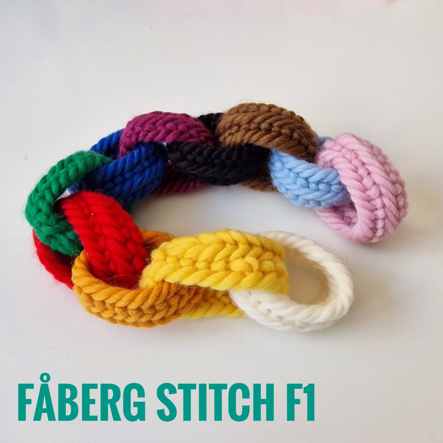 After the yellow color you start again with the starting knot and this time you needlebind with the Faberg stitch.(this stitch is wider than the Oslo stich).